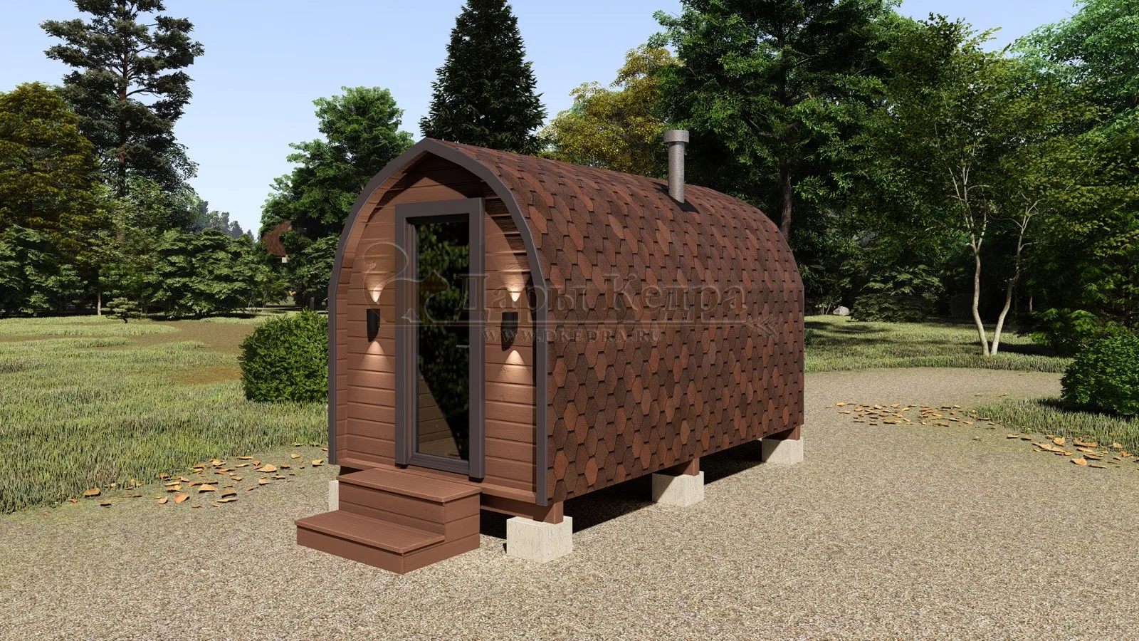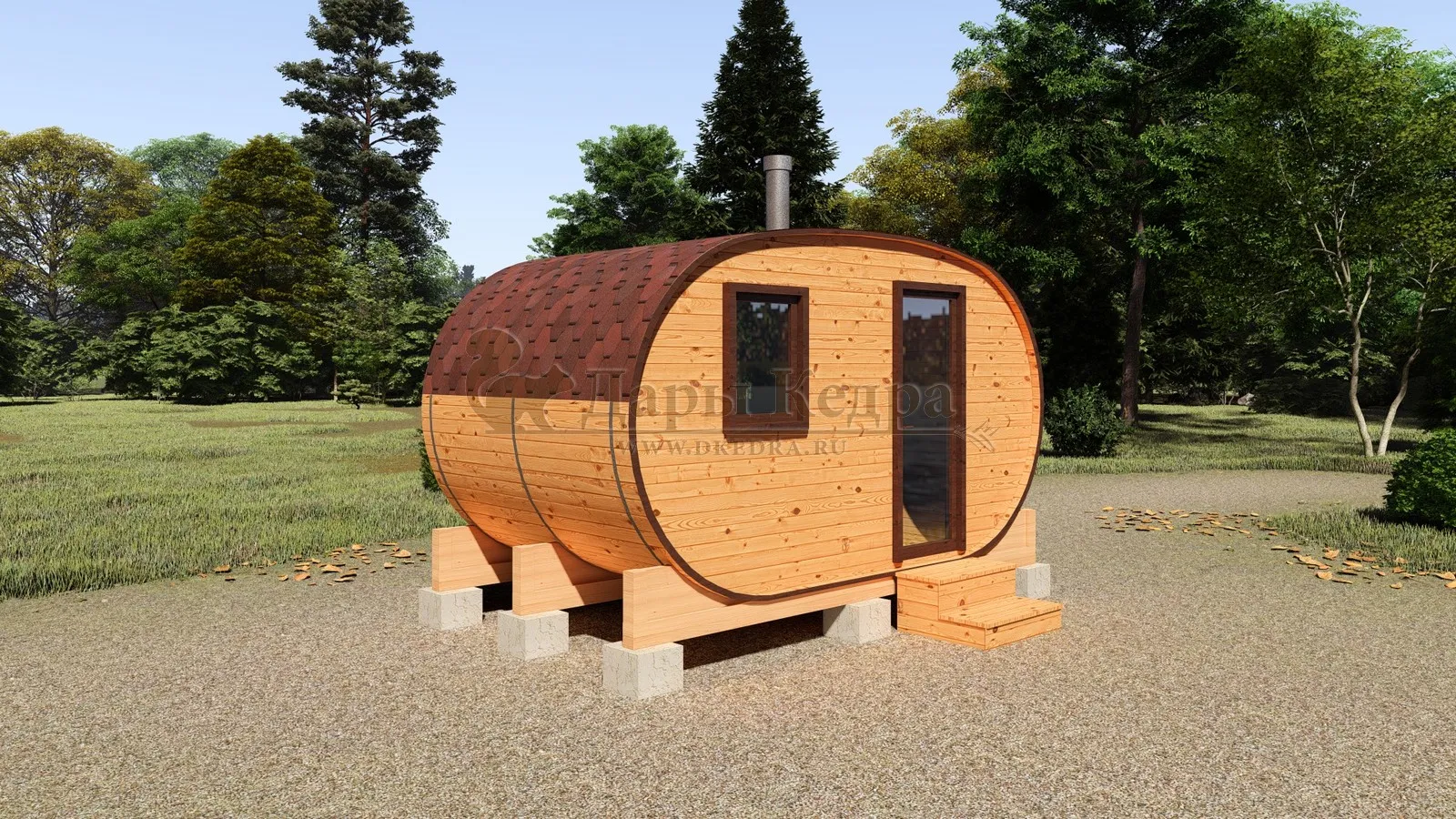 Баня-бочка круглая из кедра 2 метра Это изделие круглой вытянутой формы с одним парильным отделением. Внутреннее пространство включает в себя печь у дальней стены и лавки из кедра по обе стороны бани. За счет компактной формы баня нагревается в течение 30 минут. По вашему желанию ее можно укомплектовать козырьком, верандой и печью с внешней загрузкой, благодаря которой весь мусор после топки остается на улице. Круглая баня-бочка не требует полноценный фундамент, поэтому при необходимости ее можно перенести в другое место. Обращаем Ваше внимание, что в стандартную комплектацию бани входят лавки в парной с обеих сторон. Дополнительно можно заказать полок открытого или закрытого типа! Кедр обладает ароматическими свойствами. Он не деформируется и влагоустойчив, при правильном уходе за деревом на нем не развиваются грибки и плесень.