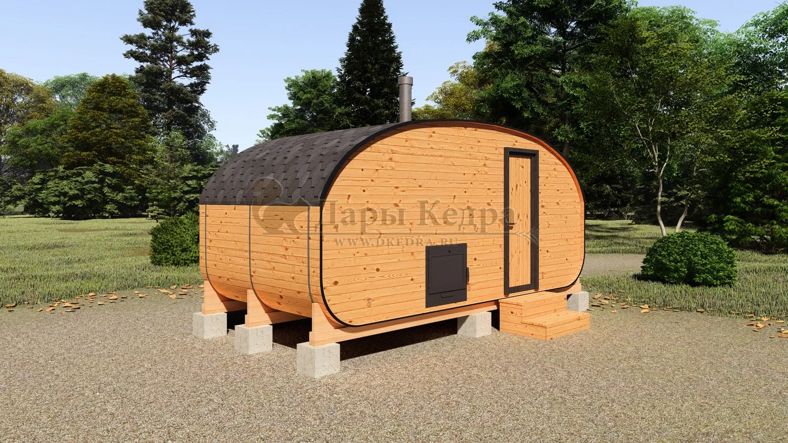 Баня-бочка буханка из кедра 3 метра Это более просторная модель за счет увеличенной высоты потолков и ровного пола. В такой модели раздевалка совмещена с моечной. Тут установлен душевой поддон, вешалка, полочка и лавочка из кедра. В парильном отделении по обе стороны расположены двухуровневые открытые полки, печь находится между ними у дальней стены. Время растопки такой бани не превышает 30 минут. По вашему желанию баню-бочку можно укомплектовать козырьком, верандой и печью с внешней загрузкой, благодаря которой весь мусор во время топки остается на улице. Баня-бочка буханка не требует полноценный фундамент, поэтому при необходимости ее можно перенести в другое место. Обращаем Ваше внимание, что в стандартную комплектацию бани входят полки открытого типа в парной с обеих сторон. Дополнительно можно заказать полок закрытого типа или лавку! Кедр обладает ароматическими свойствами. Он не деформируется и влагоустойчив, при правильном уходе за деревом на нем не развиваются грибки и плесень.