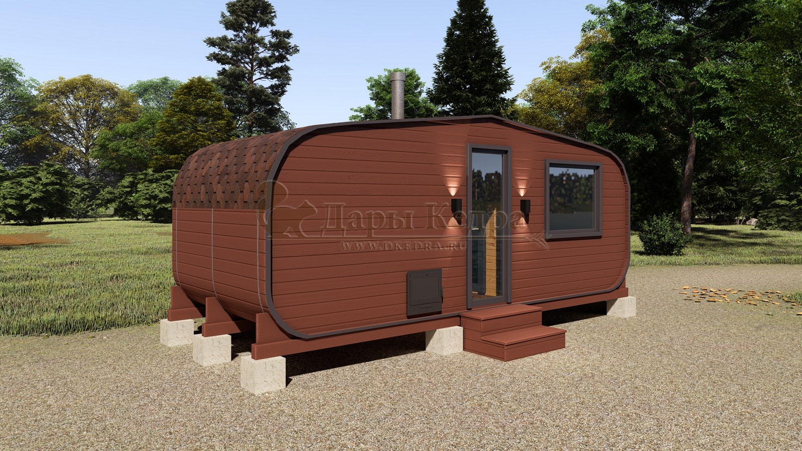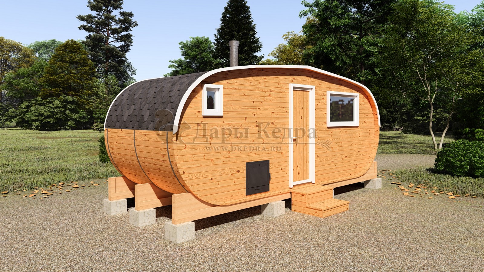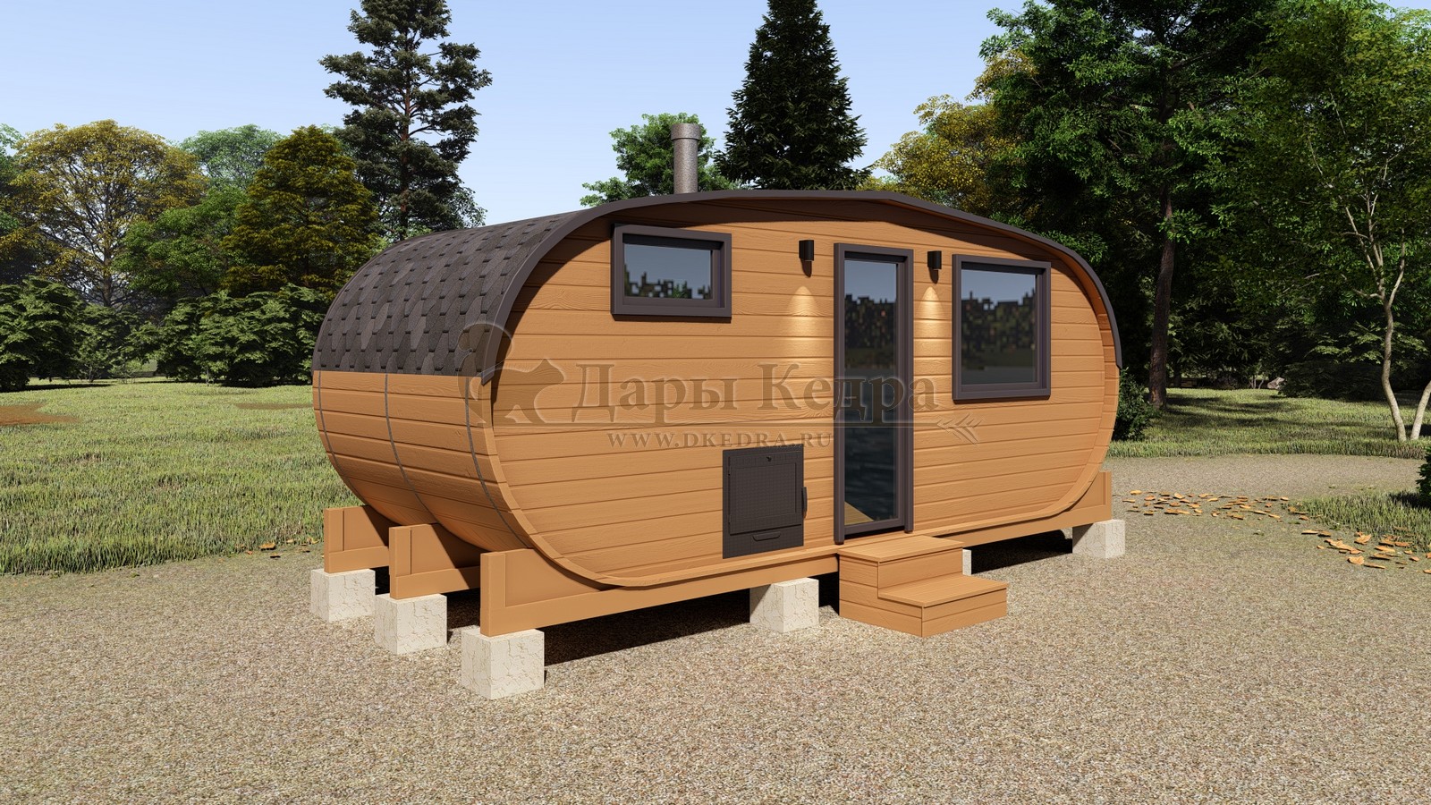 Баня-бочка круглая из кедра 3 метра Это изделие круглой вытянутой формы с двумя отделениями: раздевалкой и парной. Лавочки из кедра находятся по всей длине бани-бочки с обеих сторон. Печь расположена в парилке около дальней стены. Для удобства пользования в раздевалке установлена вешалка и полочка из кедра. За счет небольшой конструкции баня нагревается не более 30 минут. По вашему желанию баню-бочку можно дополнить печью с внешней загрузкой, благодаря которой весь мусор после топки останется на улице. Круглая баня-бочка не требует полноценный фундамент, поэтому при необходимости ее можно перенести в другое место. Обращаем Ваше внимание, что в стандартную комплектацию бани входят лавки в парной с обеих сторон. Дополнительно можно заказать полок открытого или закрытого типа! Кедр обладает ароматическими свойствами. Он не деформируется и влагоустойчив, при правильном уходе за деревом на нем не развиваются грибки и плесень.
