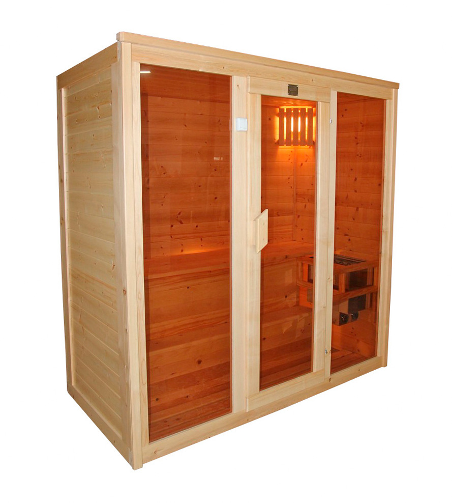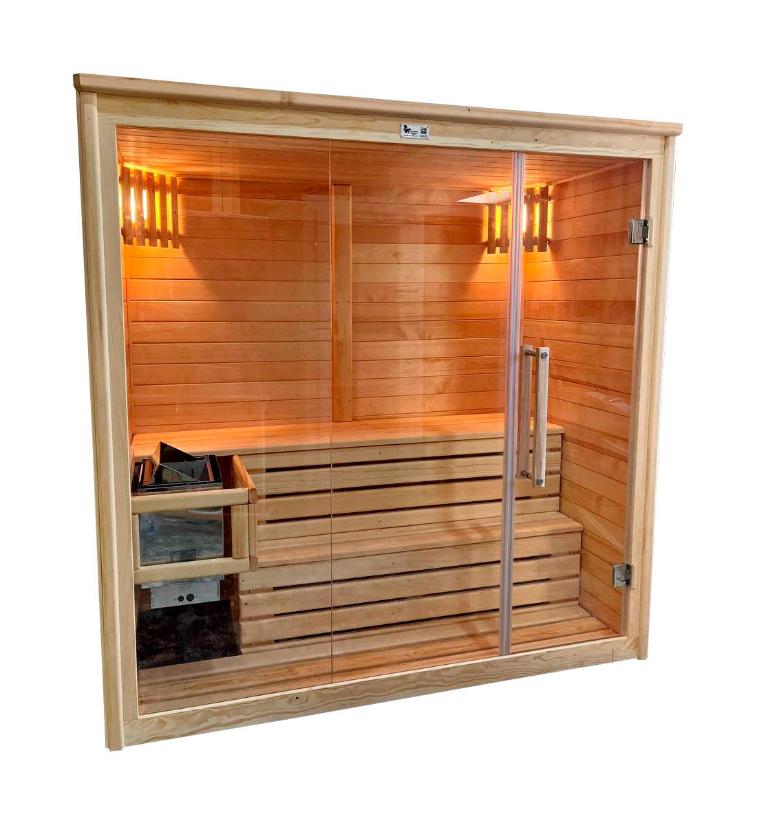 Трехместная финская сауна кабина из кедра с электрокаменкой Это специально оборудованная готовая деревянная кабина для сухого и влажного парения. Электропечь нагревает пространство внутри и позволяет сбрызгивать камни водой, слегка увлажняя воздух. Такая процедура позволяет избежать перегрева. Сауна обшита снаружи и внутри кедровой вагонкой и имеет теплоизоляционный слой. Финская сауна с электропечью подойдет, как для домашнего использования, так и для коммерции. Доставляется в разборном виде щитами, собирается по инструкции с помощью шуруповёрта. Обращаем Ваше внимание, что в стоимость сауны уже включена дверь с закаленным стеклом в раме из кедра с фиксатором и деревянным фасадом справа. Вы можете заменить фасад на цельностеклянный с безрамной дверью за дополнительную плату. Нагреваясь, древесина кедра выделяет полезные вещества-фитонциды, которые благотворно влияют на организм в целом и укрепляют иммунитет.