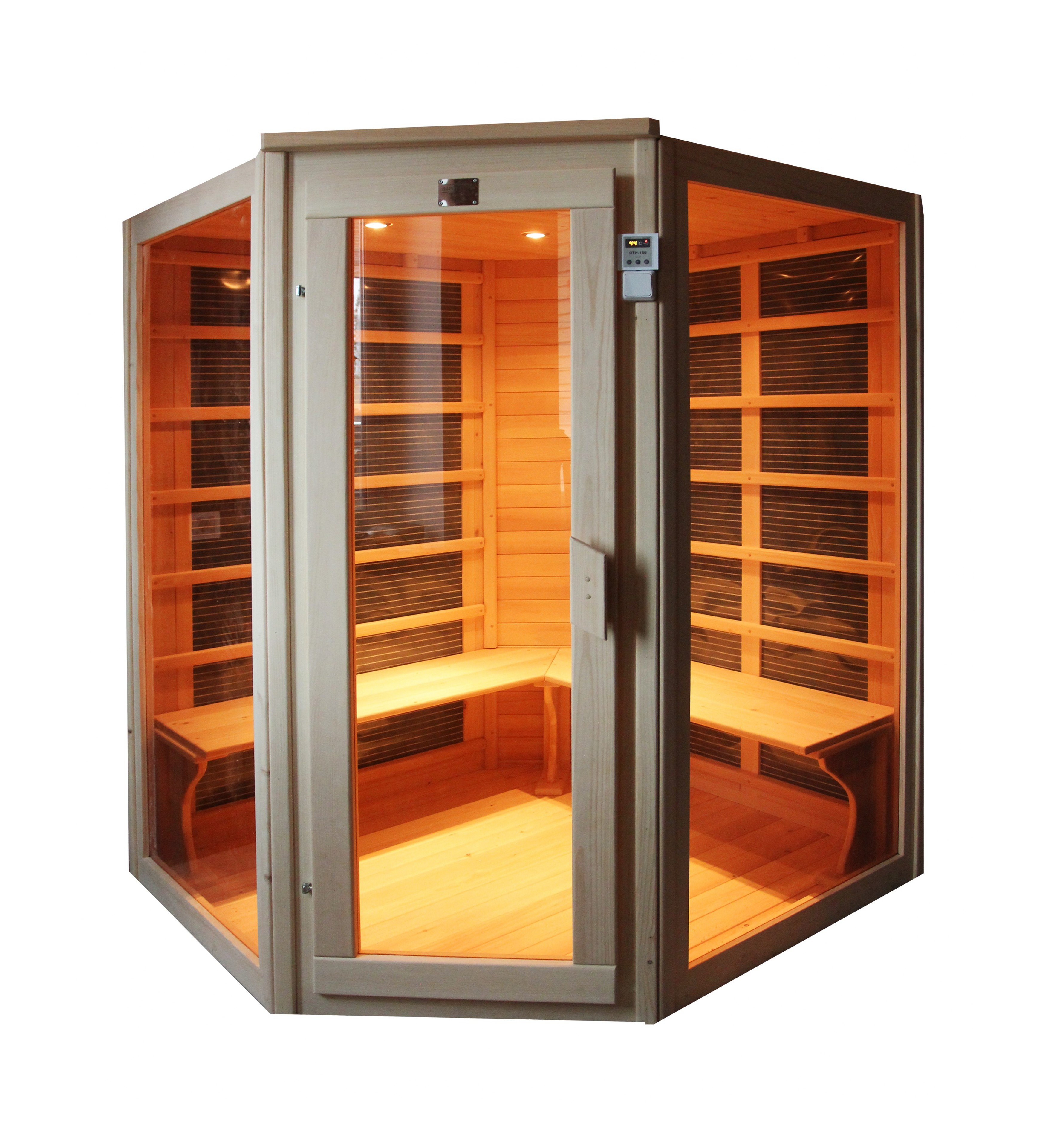 Четырёхместная угловая инфракрасная сауна кабина из кедра с карбоновыми излучателями Это специально оборудованная кедровая кабина для прогрева тела человека сухим теплом. Воздух в таких парных не нагревается. Инфракрасные лучи воздействуют на тело, равномерно прогревая мышцы, суставы и органы. Карбоновые излучатели, встроенные в стены кабины, обладают мягким прогревом, что полностью исключает возможность ожога. Работает кабина за счет электричества. Установка сауны в угол, позволяет рационально использовать пространство помещения. Подходит как для домашнего использования, так и для коммерции. Обращаем Ваше внимание что в стандартную комплектацию входит трапик для ног, но вы можете его заменить на цельный пол совершенно бесплатно! Целебная древесина кедра и инфракрасные лучи благотворно влияют на организм человека в целом. При регулярном использовании инфракрасной сауны укрепляется иммунитет, улучшается кровообращение и состояние кожи, выводятся токсины.