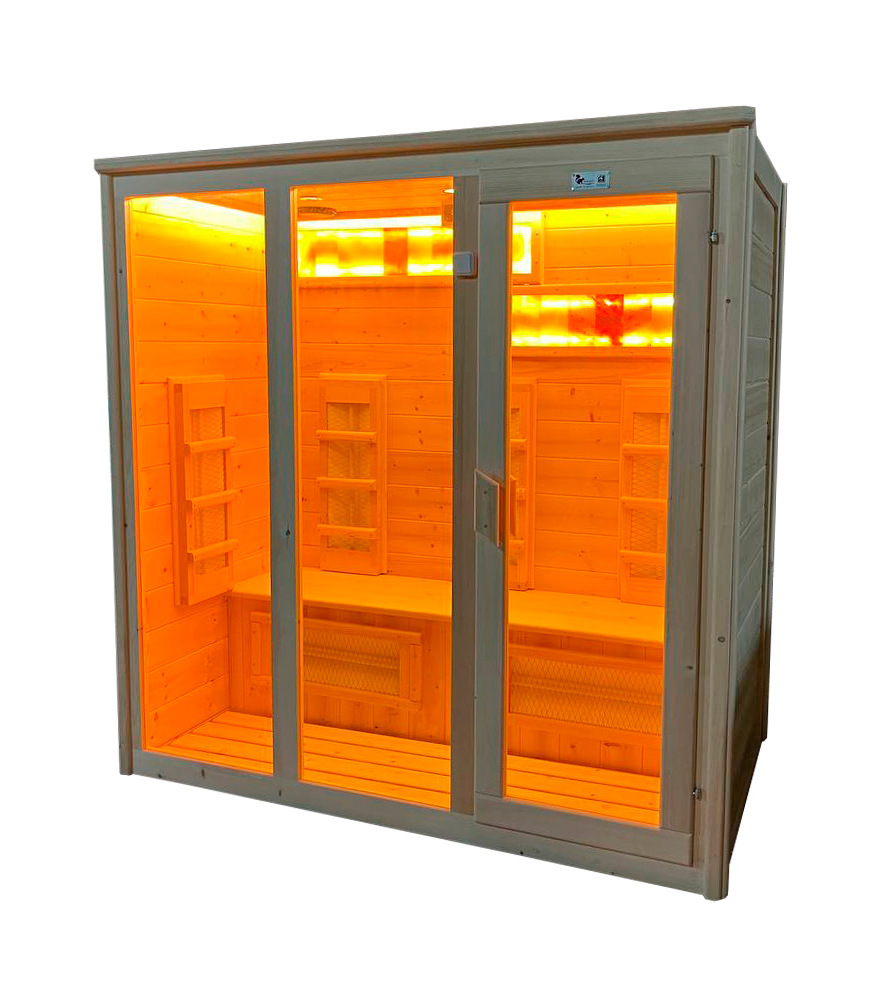 Пятиместная инфракрасная сауна кабина из кедра с карбоновыми излучателями Это специально оборудованная кедровая кабина для прогрева тела человека сухим теплом. Воздух в таких парных не нагревается. Инфракрасные лучи воздействуют на тело, равномерно прогревая мышцы, суставы и органы. Карбоновые излучатели, встроенные в стены кабины, обладают мягким прогревом, что полностью исключает возможность ожога. Работает кабина за счет электричества. Пятиместная инфракрасная сауна с карбоновыми излучателями подходит для коммерции. Обращаем Ваше внимание, что в стандартную комплектацию входит трапик для ног, но вы можете его заменить на цельный пол совершенно бесплатно! Целебная древесина кедра и инфракрасные лучи благотворно влияют на организм человека в целом. При регулярном использовании инфракрасной сауны укрепляется иммунитет, улучшается кровообращение и состояние кожи, выводятся токсины.