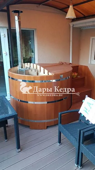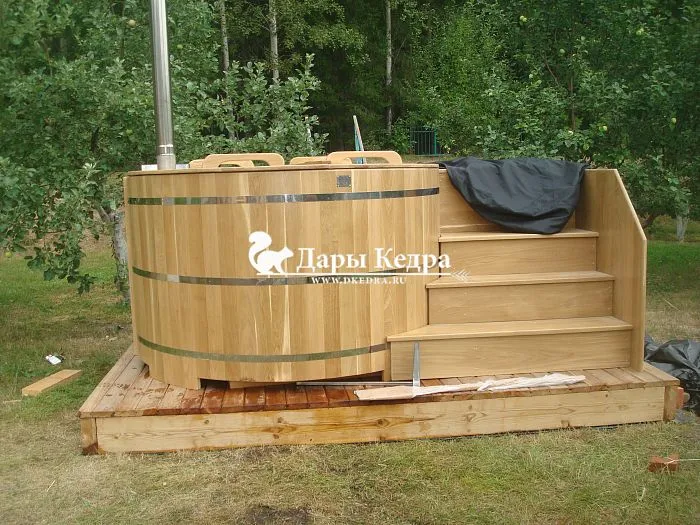 - Купель должна устанавливаться на прочную, ровную поверхность во избежание деформации под тяжестью самого изделия. Основание для фурако должно выдержит нагрузку примерно 500-600 кг. Расстояние от земли до основания купели должно быть не менее 10-15 см.