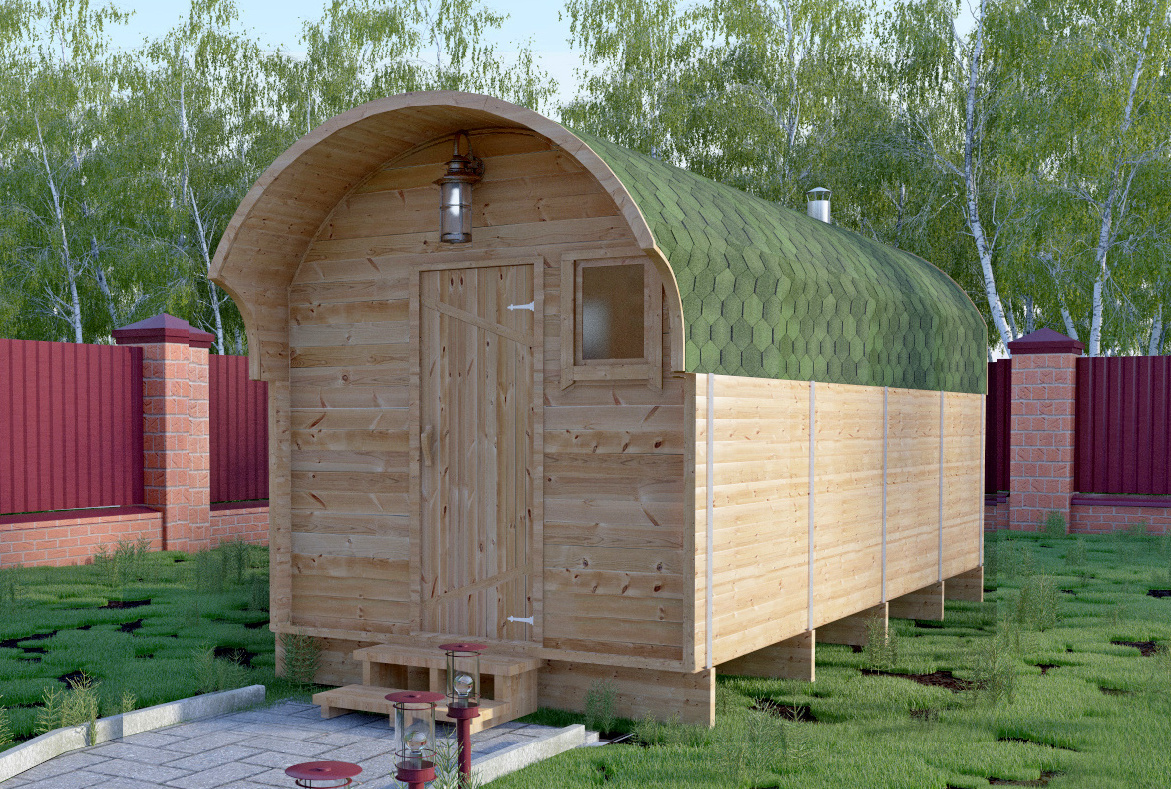Симбиоз круглой и квадратной бани-бочки. Разработано с учётом эргономики, в ней так же просторно, как и в квадро-бочке, но при этом полукруглая крыша не дает задерживаться снегу и влаге на кровле. А еще такая баня безусловно красивая, мобильная и доступная каждому!