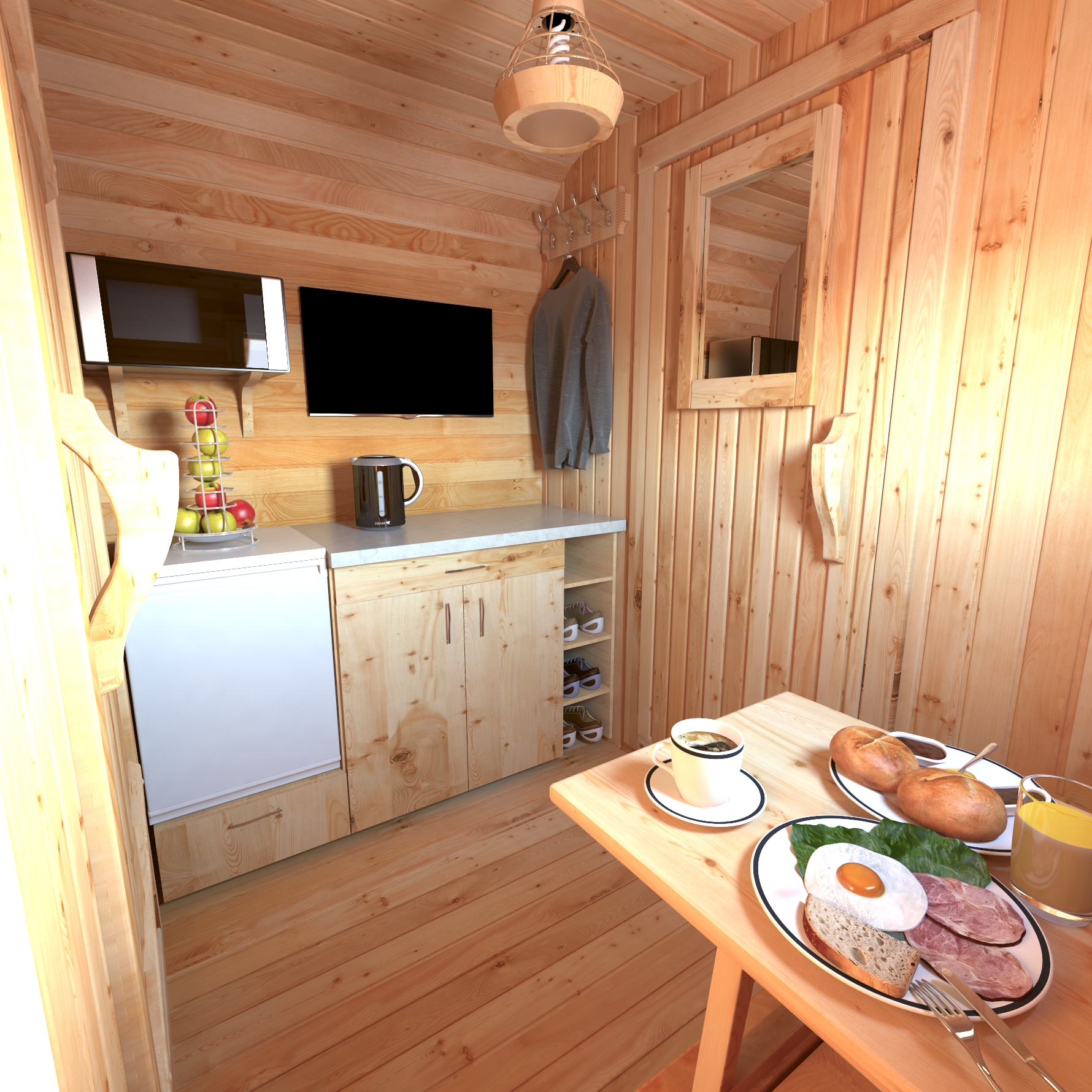 При оформлении заказа на кемпинг-дом обязательно добавьте шкаф, он точно вам пригодится для размещения вещей. Внутри - полки и штанга для аккуратного размещения одежды. Высота - 1,8 м, ширина - 0,9 м, глубина - 0,45 м.